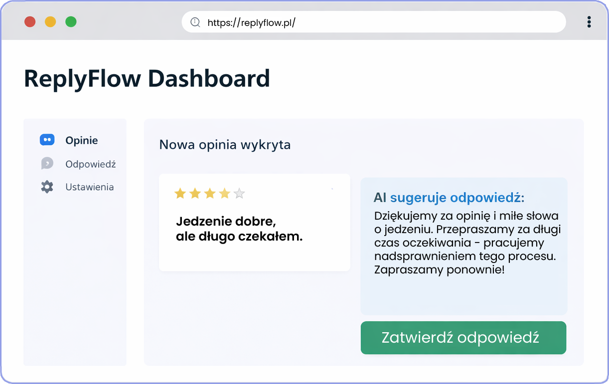 ReplyFlow wykrywa nowe opinie Google i automatycznie generuje profesjonalne odpowiedzi AI.